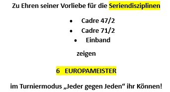 Besucher sind zu zweit oder zu dritt herzlich willkommen, um gemeinsam Spaß zu haben und die Faszination des Carambol-Billards zu entdecken.